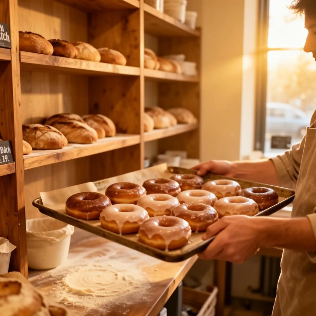 Today we bake every night in our small Warneton atelier. The dough is mixed by hand and left to rest slowly overnight, which is what gives our donuts that unmistakable airy bite. Each one is fried fresh, glazed by hand, and packed into our signature box before sunrise.